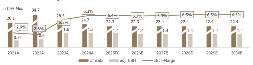 Das Unternehmen befindet sich auf Erfolgskurs – in den vergangenen Jahren wurde es gezielt modernisiert und nachhaltig rentabilisiert. Beide Geschäftsbereiche bleiben langfristig stabile Ertragsquellen mit überschaubarem Aufwand. Die Werkstatt bietet Premiumleistungen zu Preisen, die bis zu 40% unter der Konkurrenz liegen. Durch gestaffelte Preiserhöhungen ergibt sich ab 2030 ein zusätzlicher EBIT von rund CHF +0.7 Mio. pro Jahr gegenüber dem untenstehenden Fortführungsszenario.
